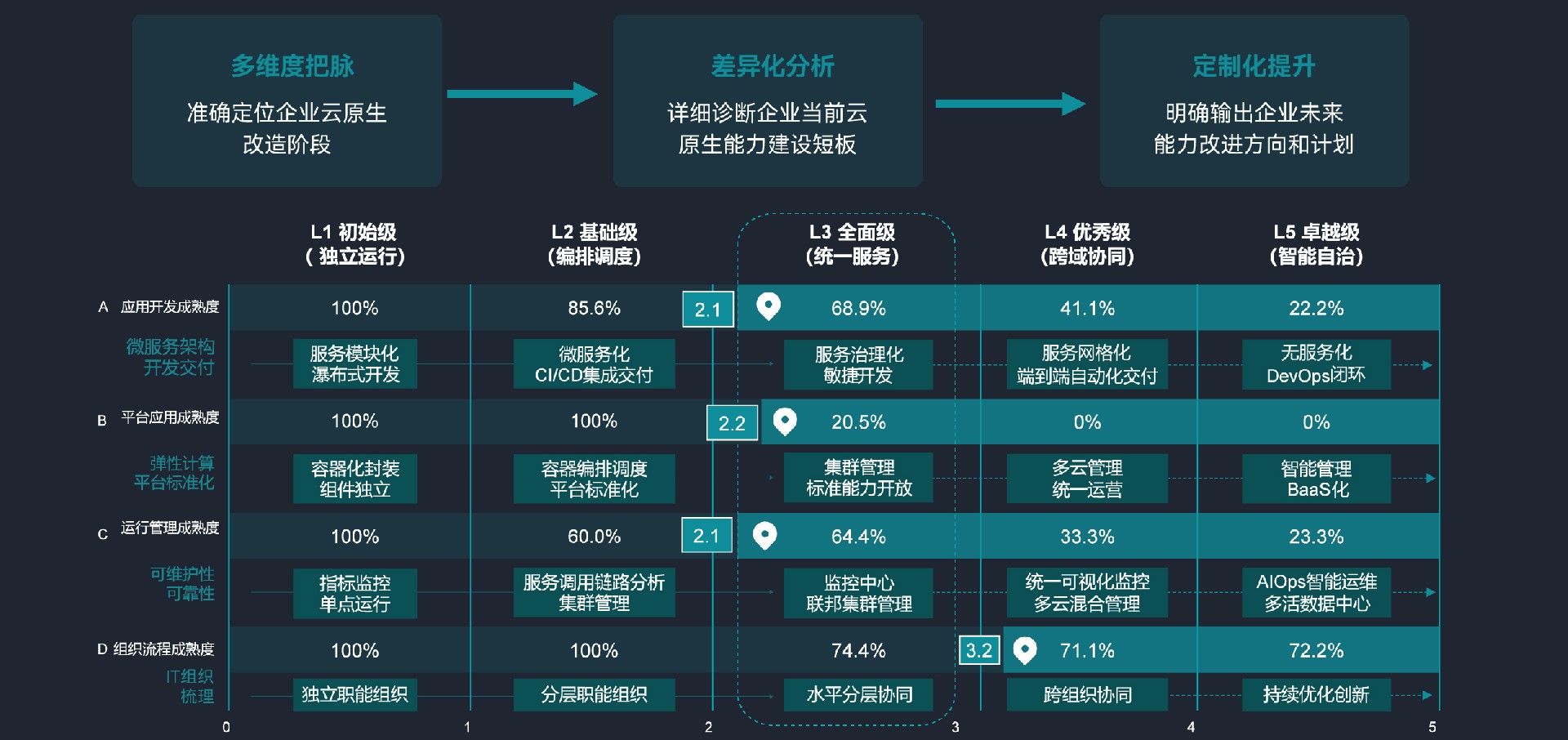 模型为其建立了可量化的指标体系和评测工具,可以使得云原生能力的评估和管理变得可量化和可管理,帮助客户更加细致、精准地掌握云原生能力的发展情况。
