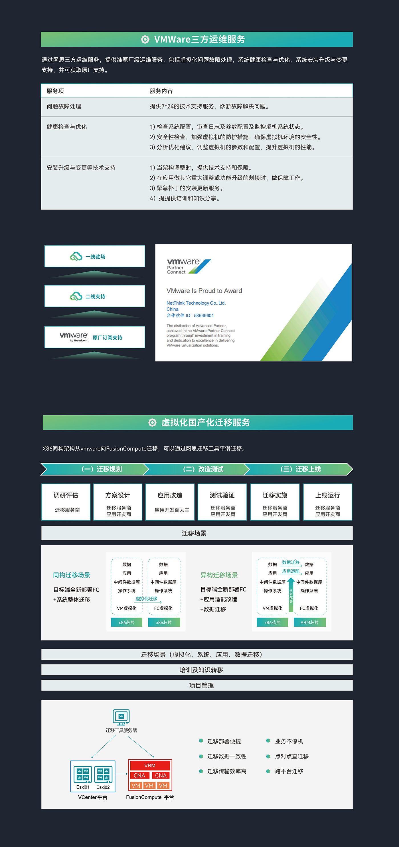 江南网页版页面登录作为VMWare产品服务授权代理商和服务商,具有专业的服务团队、服务方案和服务经验,提供VMware三方运维和国产化迁移替代服务。